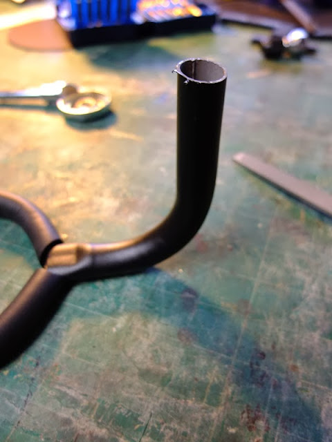 Then the threaded part of the cymbal stand fit right in. I slipped the lag shield into the tube of the neck-rest until the end of it is flush, then screwed so the threads right into the lag shield, spreading the two halves of it until it's snug.